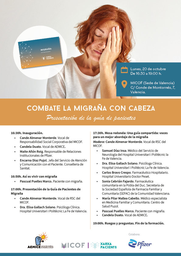 MICOF. Muy Ilustre Colegio Oficial de Farmacéuticos de Valencia en colaboración con la Escuela de Pacientes de la Escuela Andaluza de Salud Pública (EASP) y la Asociación Española de Migraña y Cefalea (AEMICE).