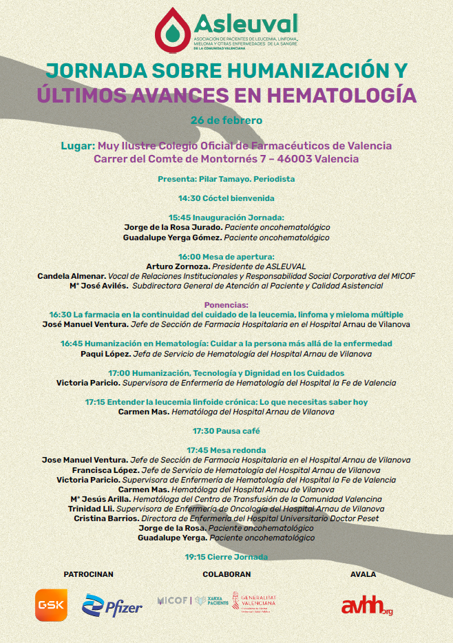 - 16:45 horas. Humanización en Hematología: Cuidar a la persona más allá de la enfermedad. Paqui López, jefa de Servicio de Hematología del Hospital Arnau de Vilanova.