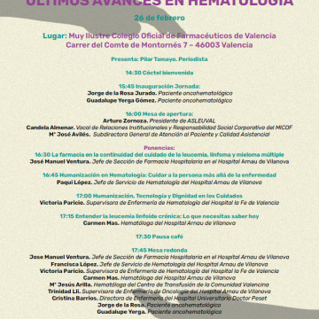 - 16:30 horas. La farmacia en la continuidad del cuidado de la leucemia, linfoma y mieloma múltiple. José Manuel Ventura, jefe de Sección de Farmacia Hospitalaria en el Hospital Arnau de Vilanova.